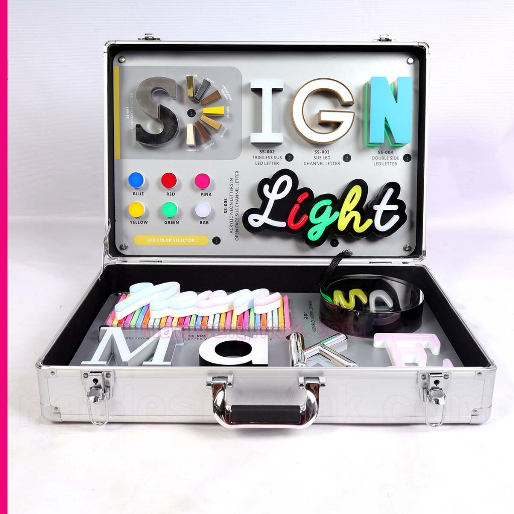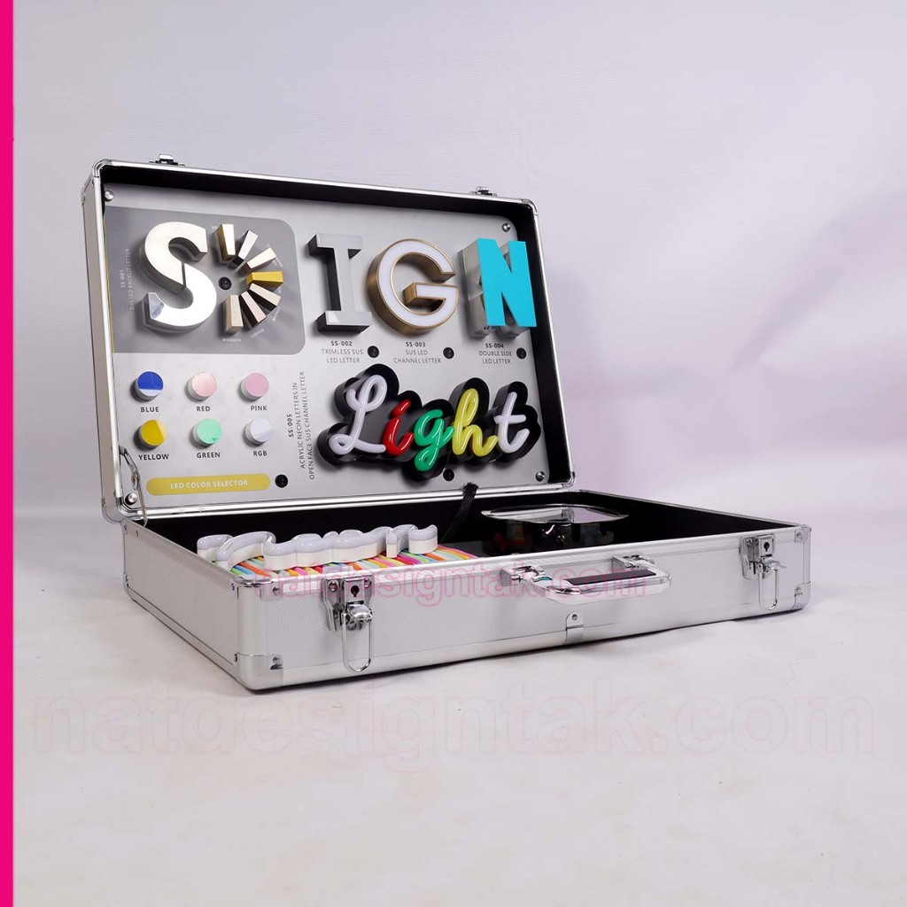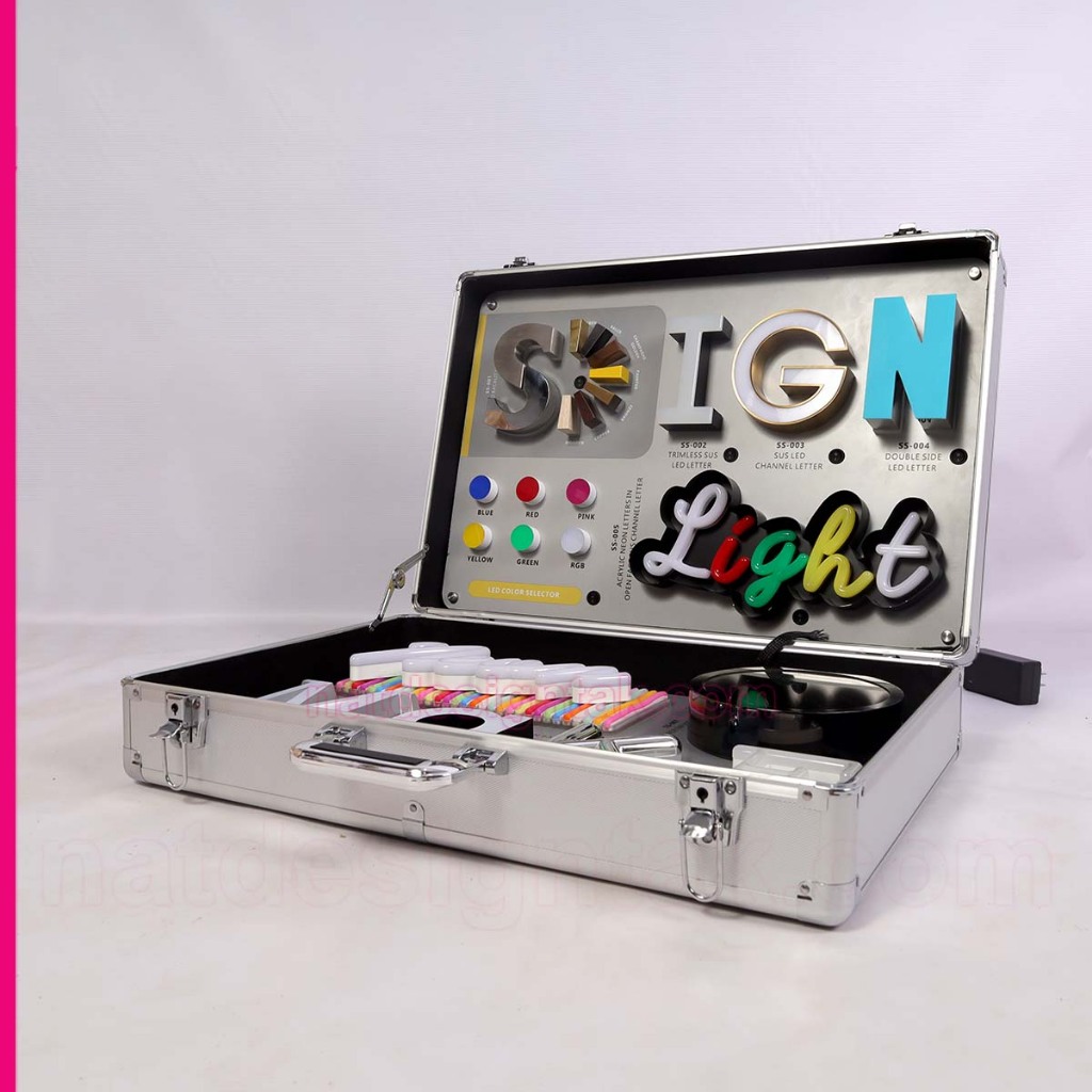 กระเป๋าแนะนำวัสดุ ชิ้นงานกระเป๋าสำหรับการแนะนำวัสดุต่างๆ ที่นำมาผลิตเป็นตู้ไฟ ตัวอักษรป้ายไฟต่างๆ เหมาะสำหรับร้านทำป้ายที่ต้องการแนะนำวัสดุต่างๆให้กับลูกค้าได้เข้าใจ ตามด้วยที่สามารถต่อไฟให้เห็นชิ้นงานตัวอักษรได้อย่างชัดเจน ชิ้นงานมีทั้งความสวยงาม พรีเมียม แข็งแรงโดดเด่น พกพาวัสดุจำนวนมากไปไหนมาไหน ได้ง่ายกว่าปกติ จัดเก็บเป็นกระเป๋าอย่างสวยงาม
